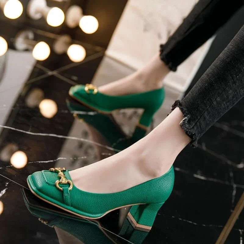 Nowe buty damskie na średnim obcasie, buty na kwadratowym grubym obcasie, styl francuski, czarno-zielony 2024.